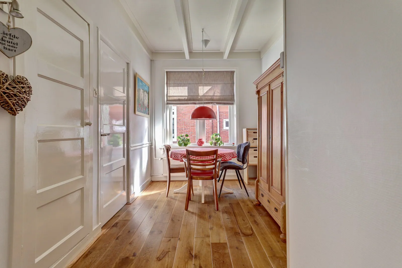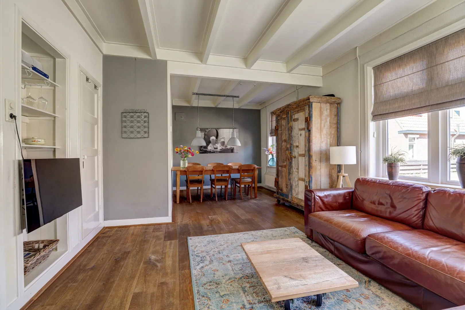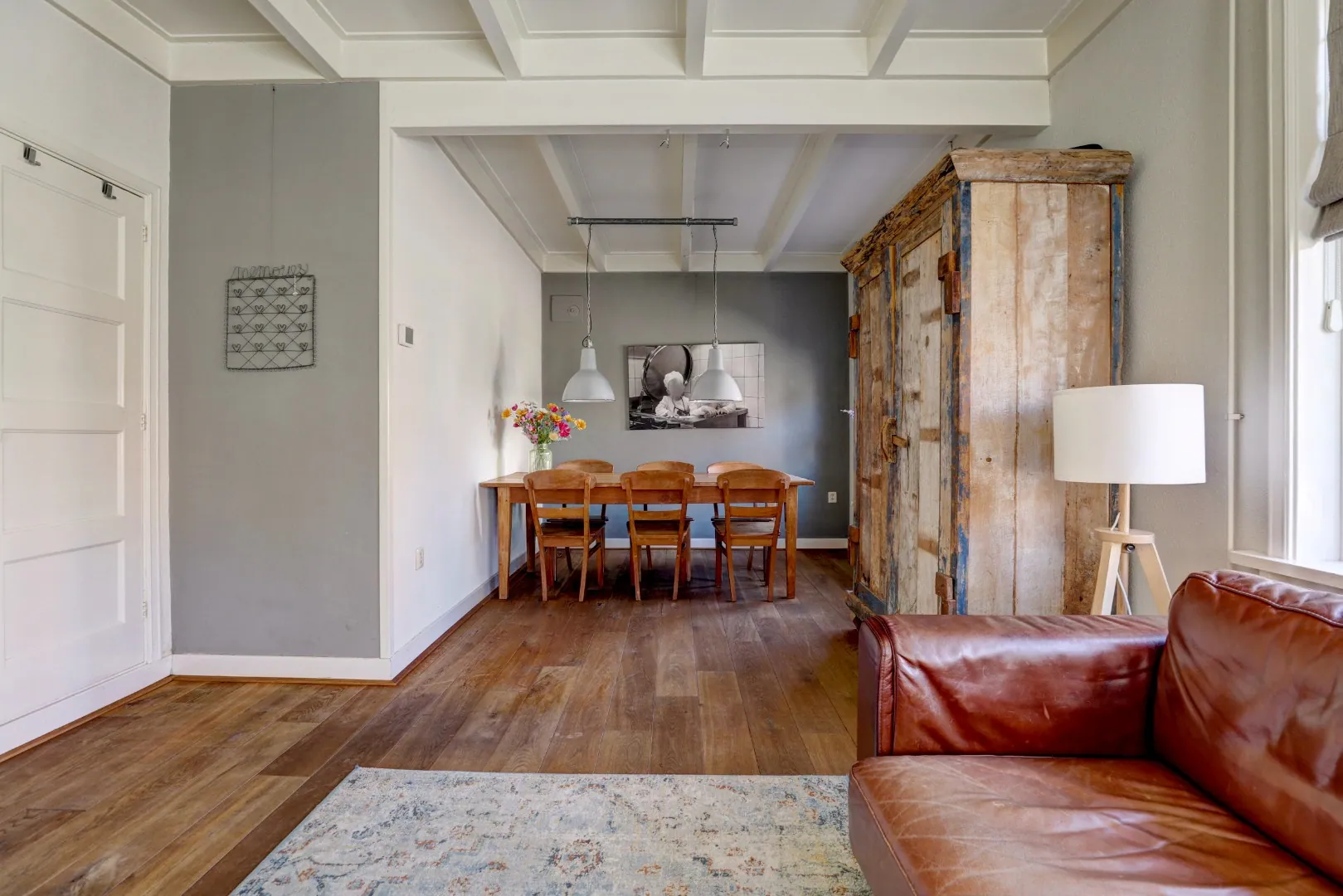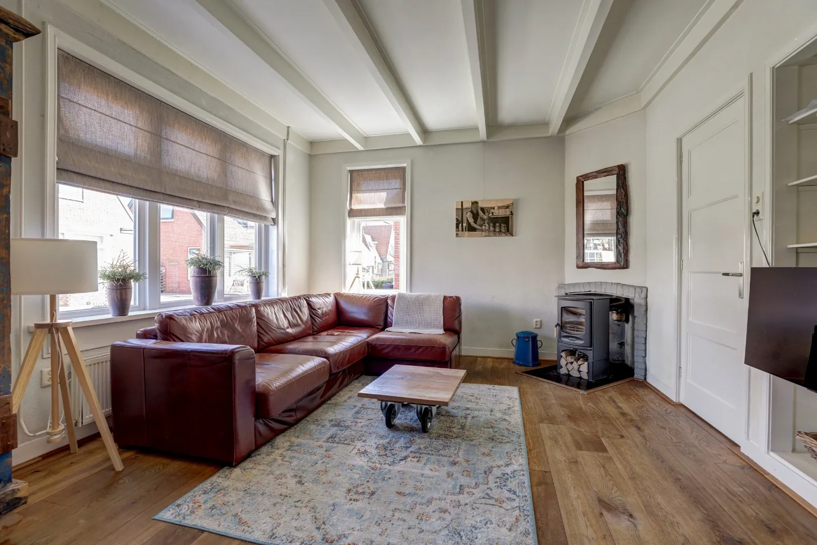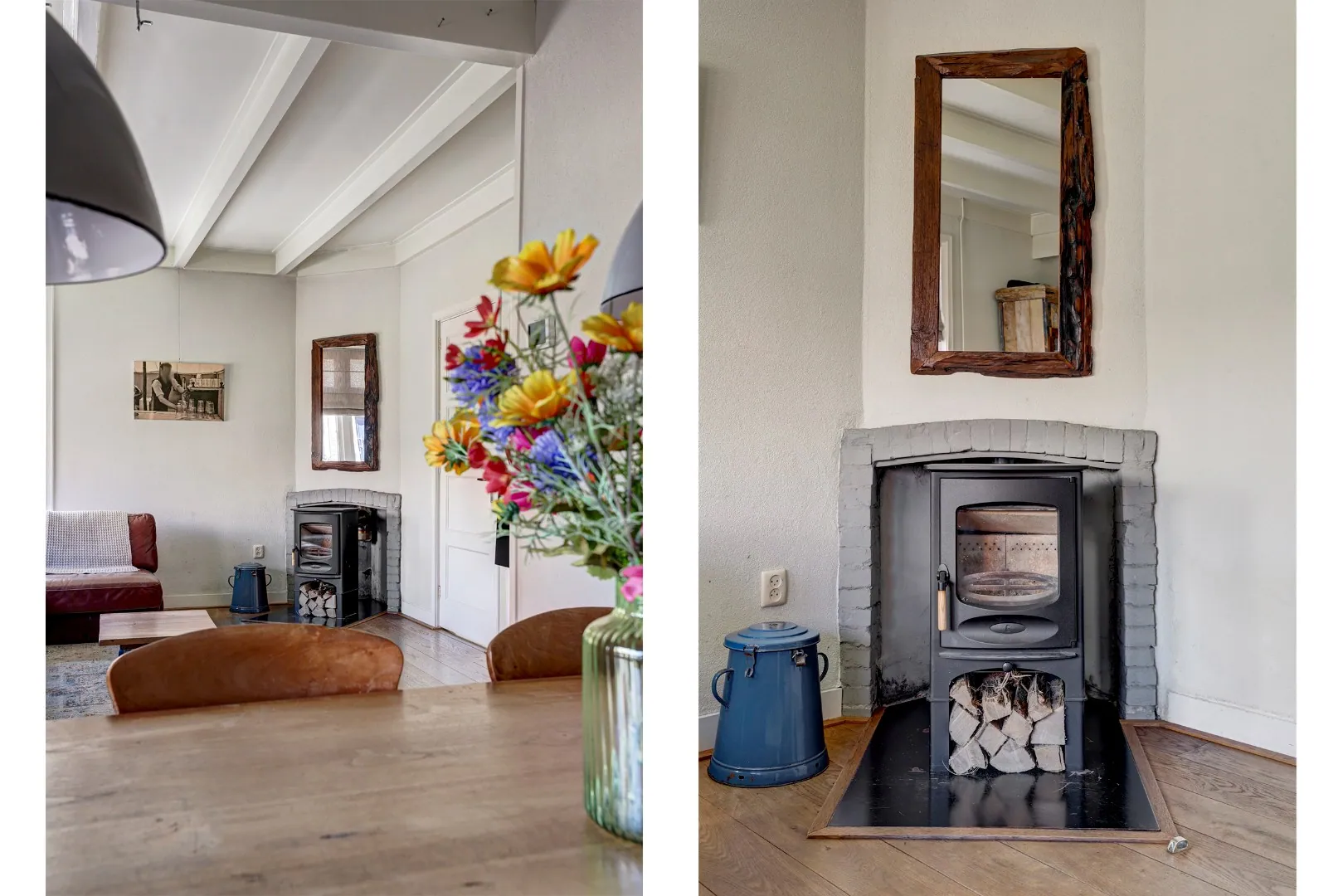 Ook de woning zelf maakt een verzorgde en solide indruk, met een prettige uitstraling die direct vertrouwen geeft. Binnen tref je een sfeervolle woonkamer met balkenplafond en houtkachel, die zorgt voor een warme en huiselijke ambiance. De ruimte loopt mooi door richting de eetkamer, waardoor er een natuurlijke verbinding ontstaat tussen de verschillende leefruimtes.