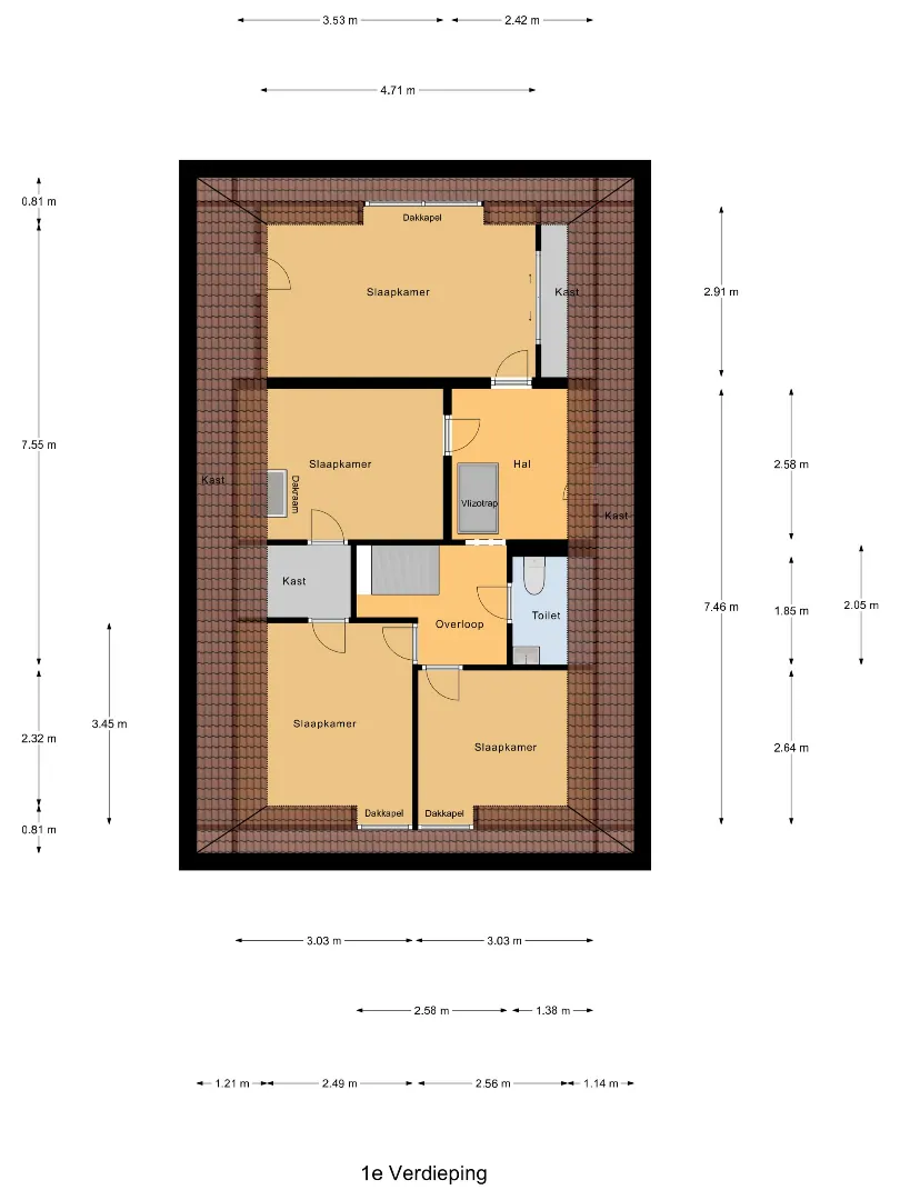 Op de verdieping zijn meerdere slaapkamers aanwezig, evenals praktische bergruimte in de knieschotten en een extra toilet.
