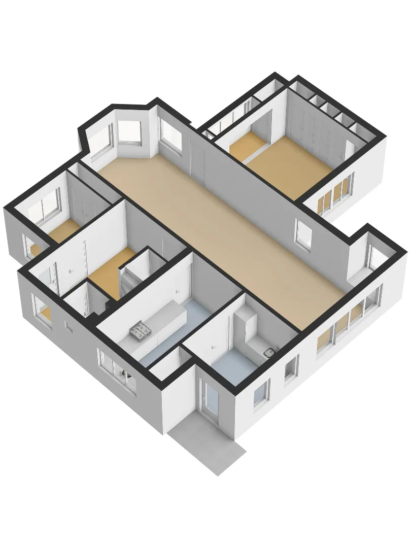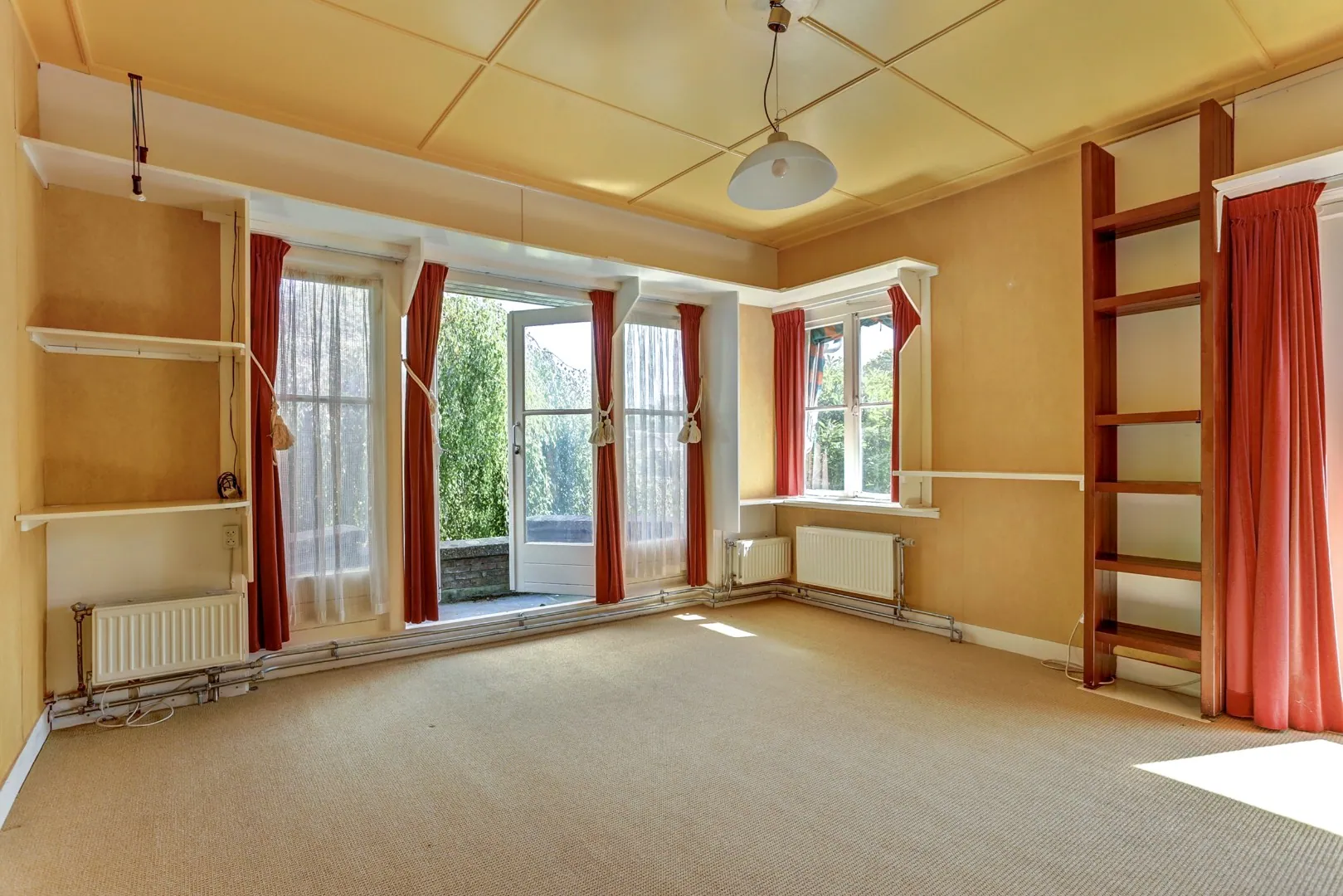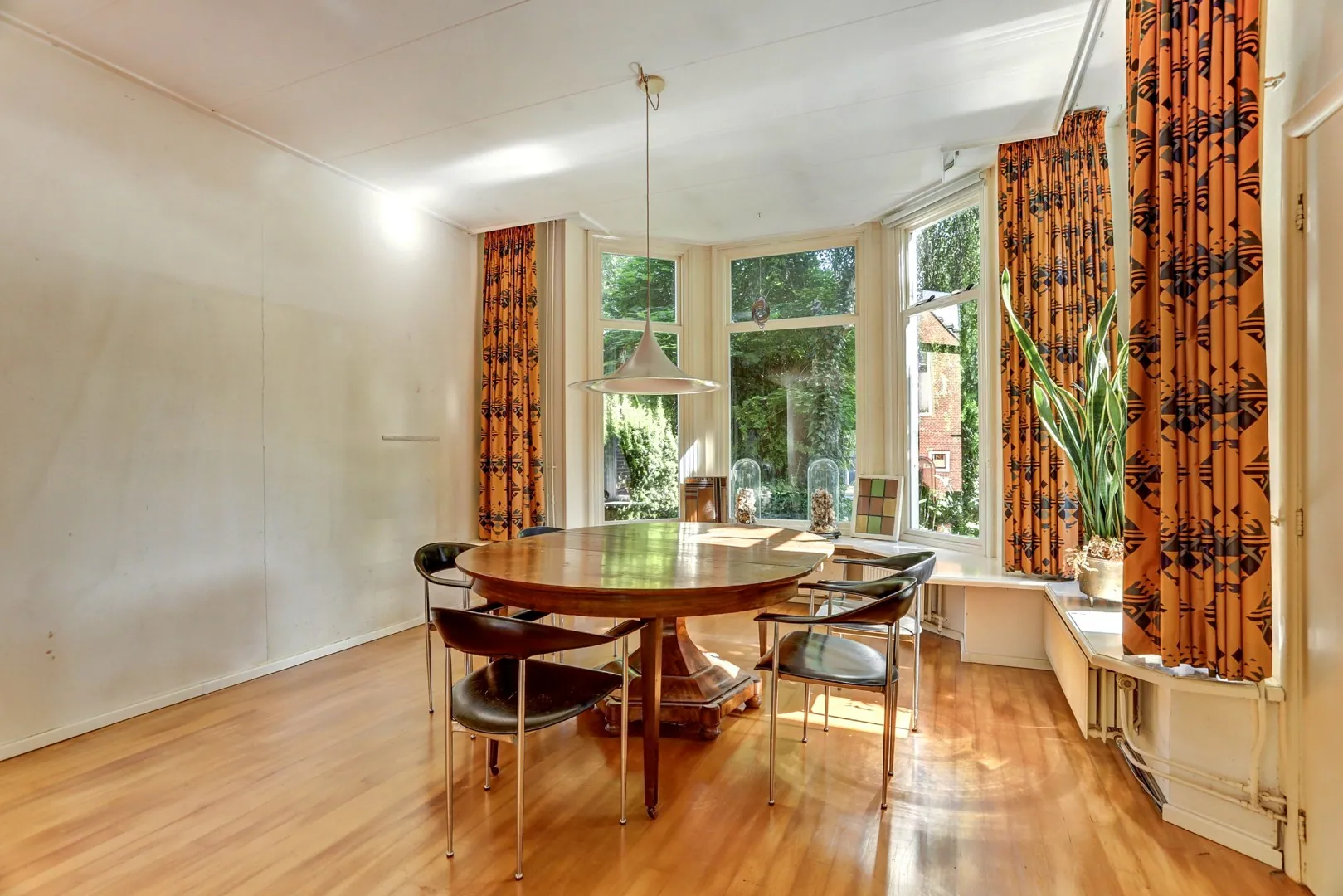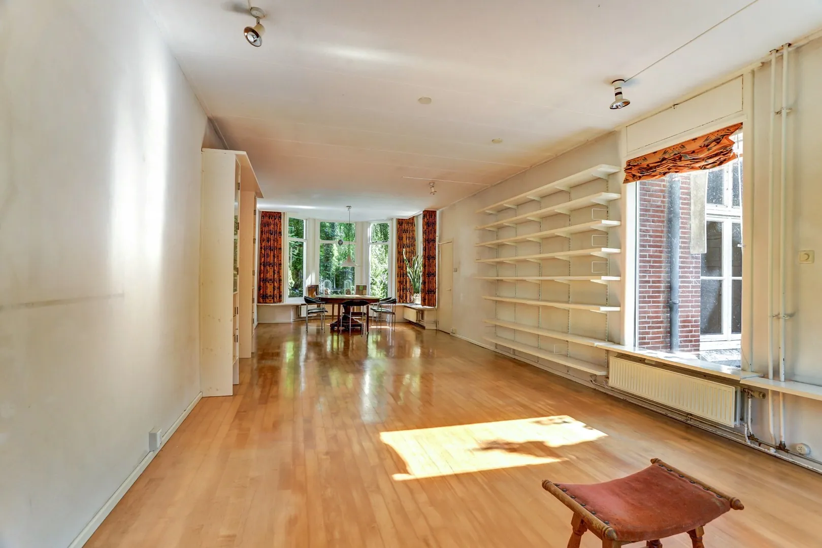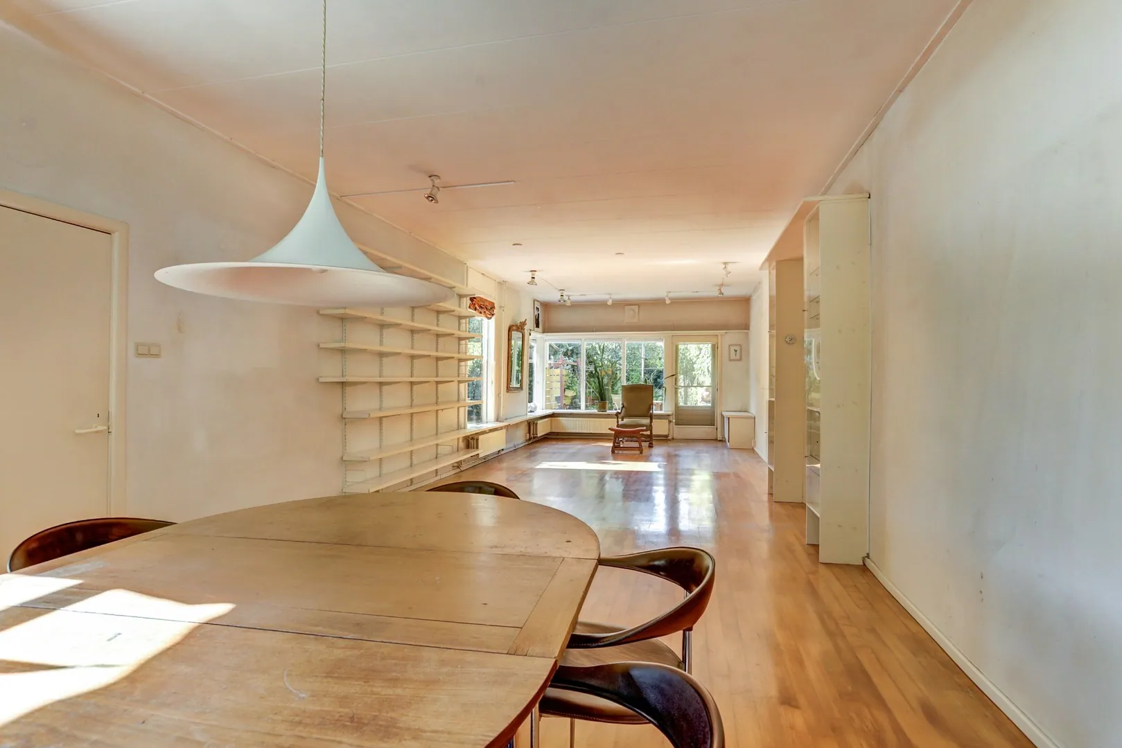 De grote woonkamer strekt zich diep naar achteren uit en is een lichte ruimte die uitnodigt om groots in te richten. Hier kan zowel een royaal zitgedeelte als een lange eettafel tot hun recht komen, terwijl de lichtinval en de open verbinding met de tuin voor een natuurlijke levendigheid zorgen. Openslaande deuren verbinden het woongedeelte direct met de achtertuin, waardoor binnen en buiten in elkaar overgaan.