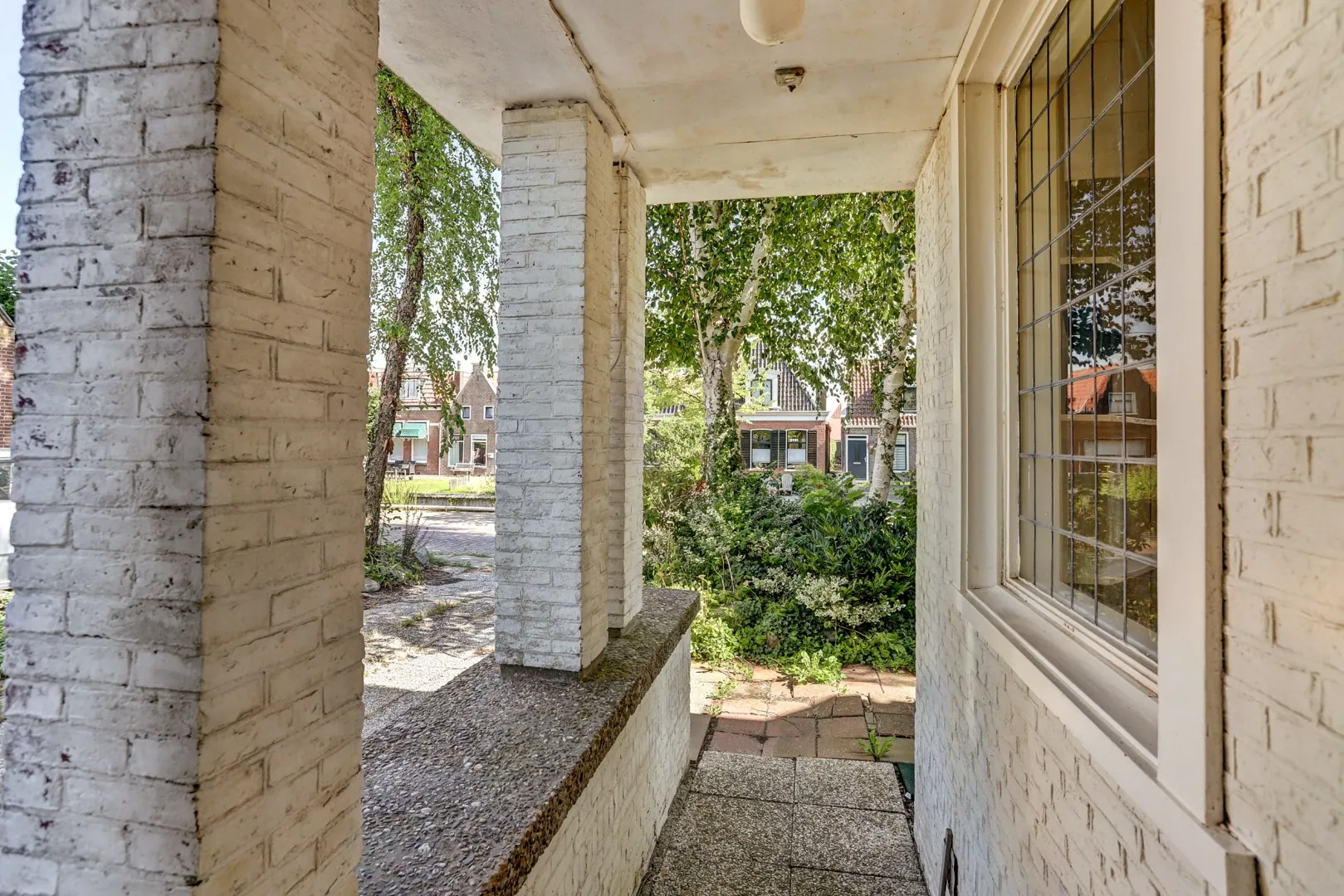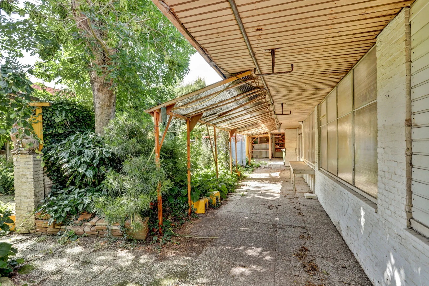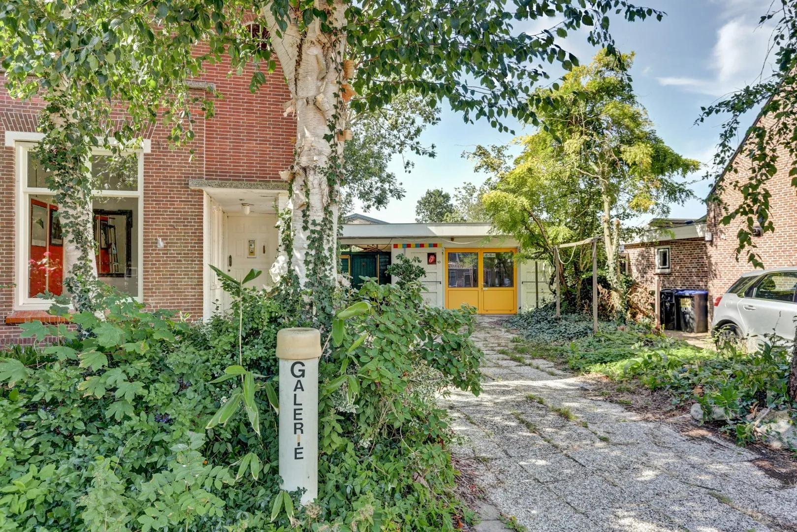 Langs de galerie loopt een groot overdekt afdak, ideaal als beschutte buitenruimte of opslag, en er is bovendien een praktische zij-entree zodat de tuin ook achterom bereikbaar is. Daarmee vormt de tuin de verbindende schakel tussen woonhuis en galerie: een groene omlijsting die het geheel compleet maakt.
